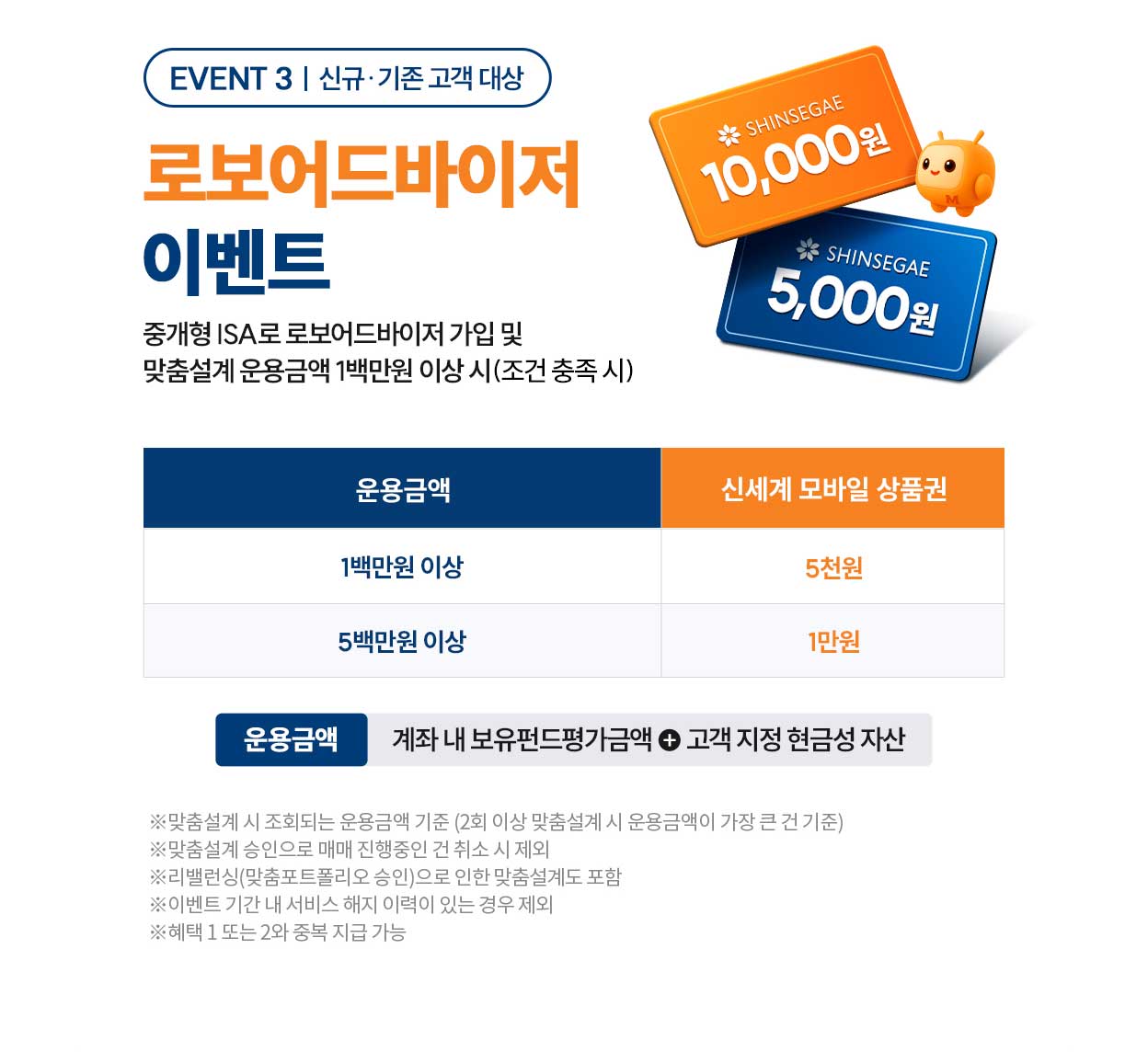 - ㆍ혜택3(로보어드바이저 이벤트)은 혜택1과2, 스페셜 이벤트에 당첨되시더라도 중복 지급 가능합니다.