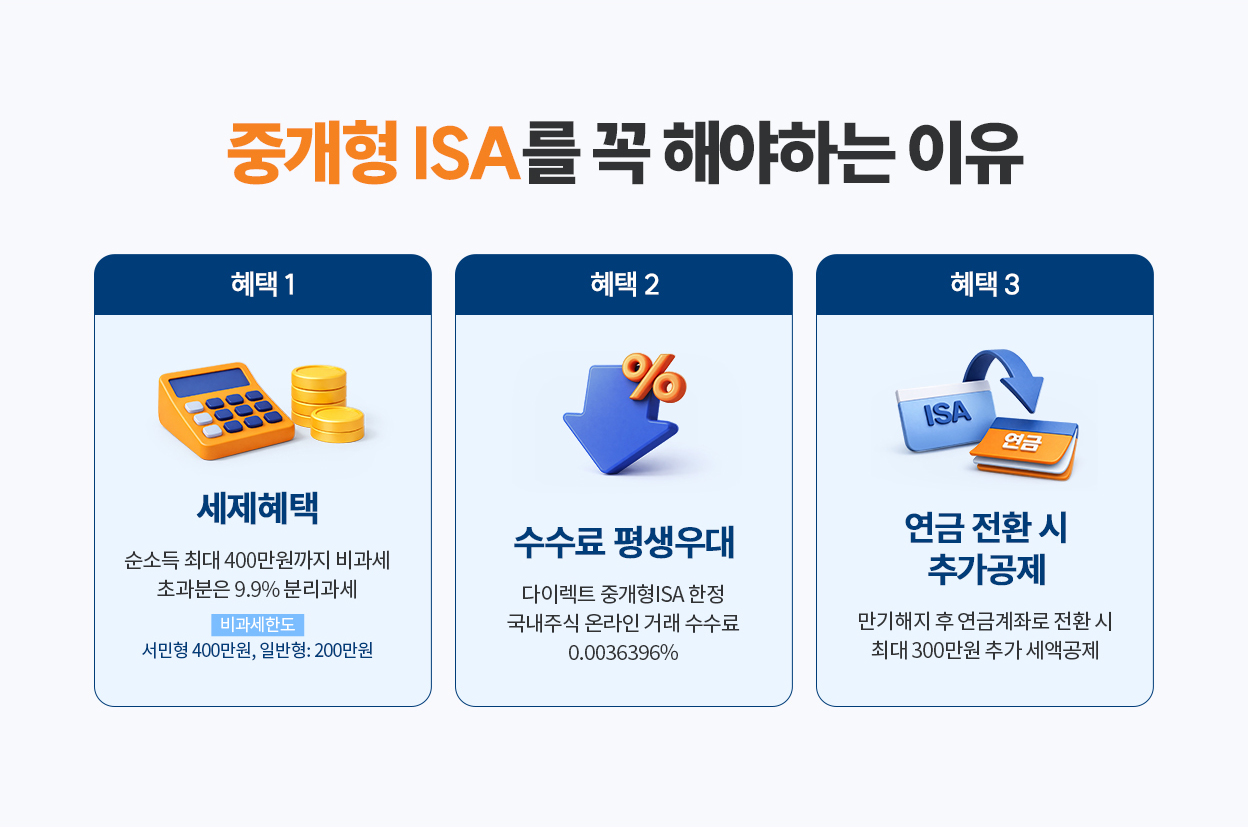 - ㆍ개인종합자산관리계좌(ISA) 중 ‘중개형’은 보수는 없으나 위탁수수료 및 금융투자상품별 수수료,보수 등의 비용을 부담할 수 있습니다.