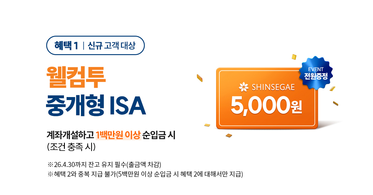 - ㆍ이벤트 기간 내 기존 보유한 중개형ISA 계좌를 해지하여 재개설하는 경우에 해지한 금액은 순입금액에서 제외됩니다 (만기해지 포함).