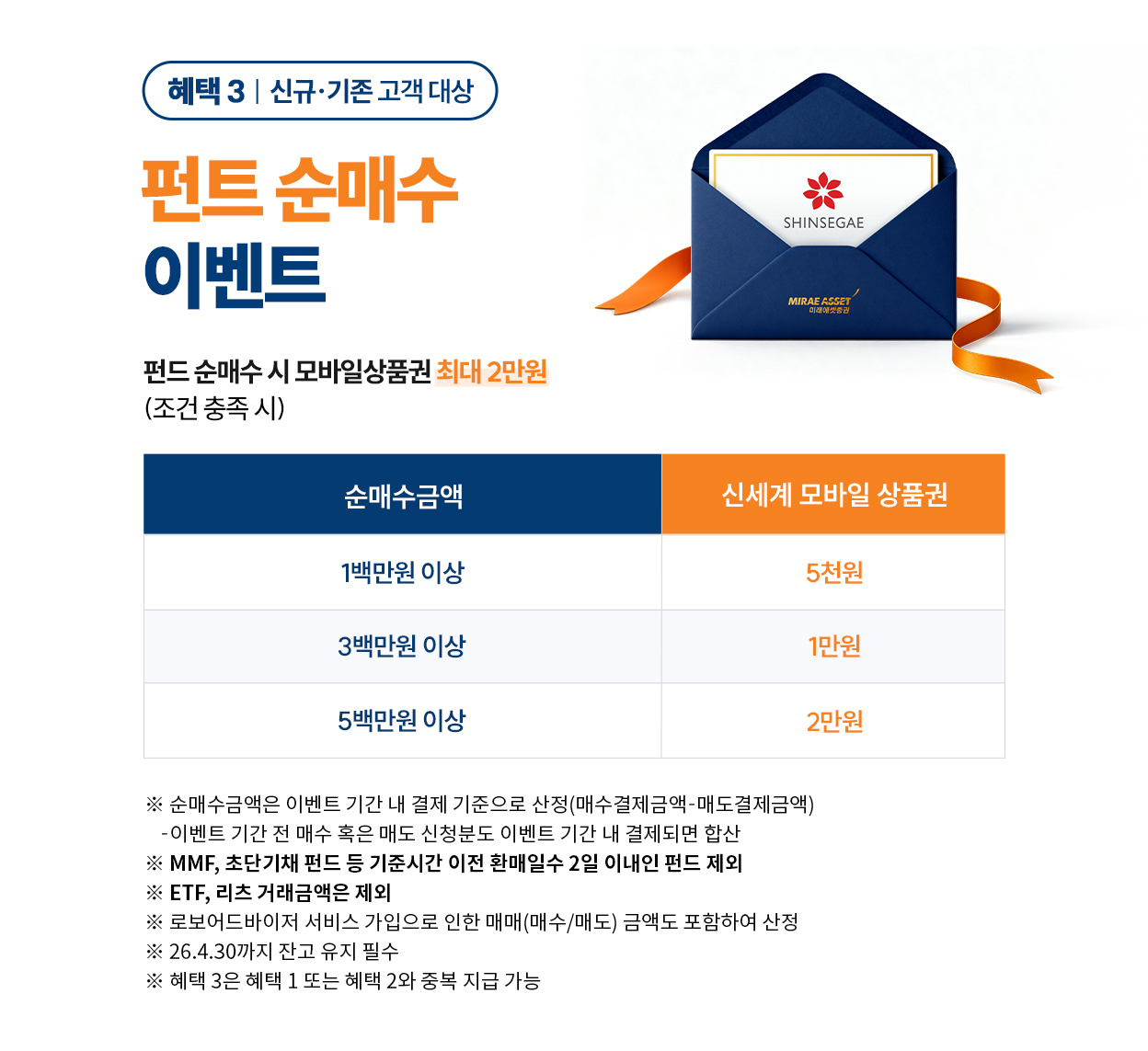 - ㆍ펀드 순매수금액은 결제가 완료된 금액으로 이벤트 기간 내 결제기준으로 산정합니다. 이벤트 기간 전 매수 혹은 매도 신청하셨더라도 이벤트 기간에 결제된 펀드 매수/매도분도 순매수금액 계산에 포함됩니다.