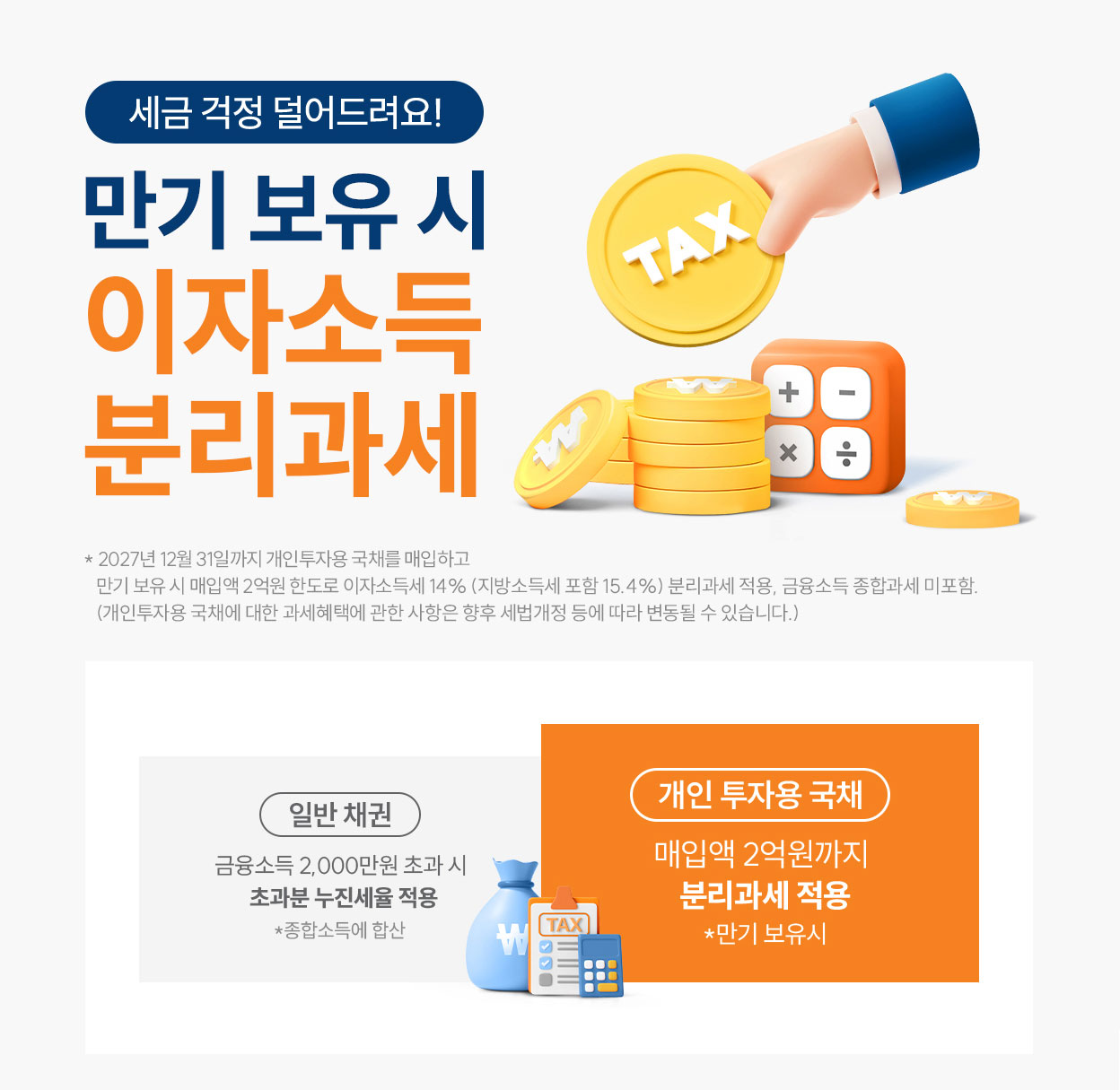 · 개인투자용 국채의 세제혜택은 조세특례제한법에 따라 2027년 12월 31일까지 매입금액에 한해 적용되며, 향후 세법개정 등에 따라 변동될 수 있습니다.(만기보유 시 분리과세, 매입액 2억원한도)