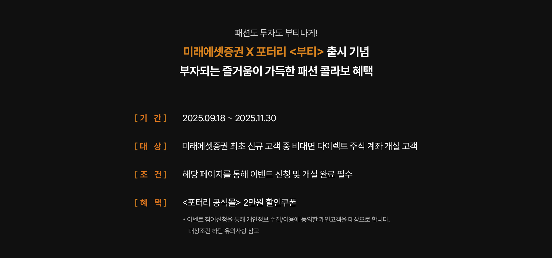 - - 모든 이벤트는 미래에셋증권의 사정에 따라 일정이 변경되거나 중단될 수 있습니다. (단, 기조건 충족 고객 및 당첨 고객 제외)