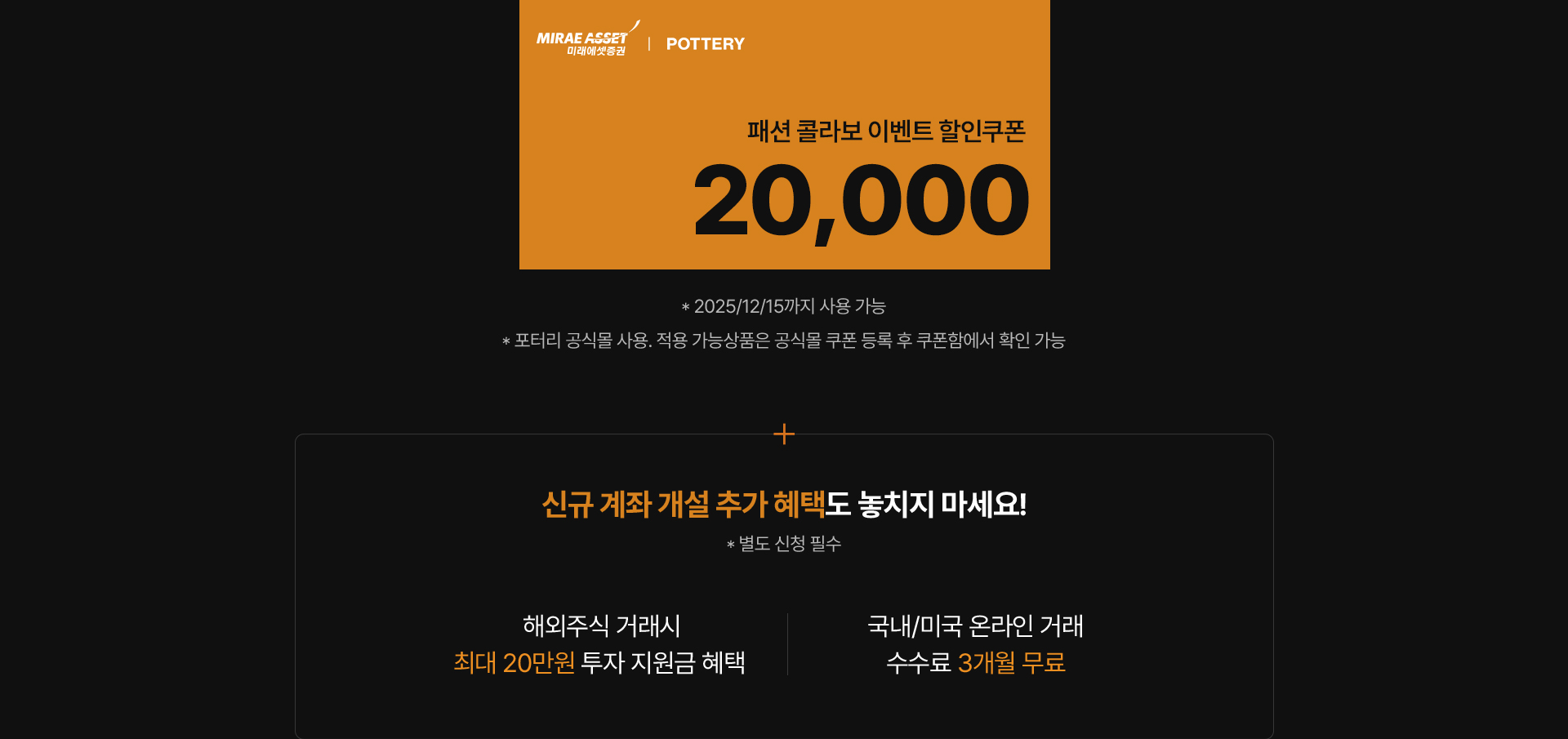 - - 개설축하금 포터리 2만원 할인쿠폰 지급은 실시간으로 지급되며 이벤트 대상 계좌(미래에셋증권 주식계좌) 상태가 ‘정상’인 고객에 한하여 혜택이 지급됩니다. (계좌폐쇄 시 지급 대상 아님)