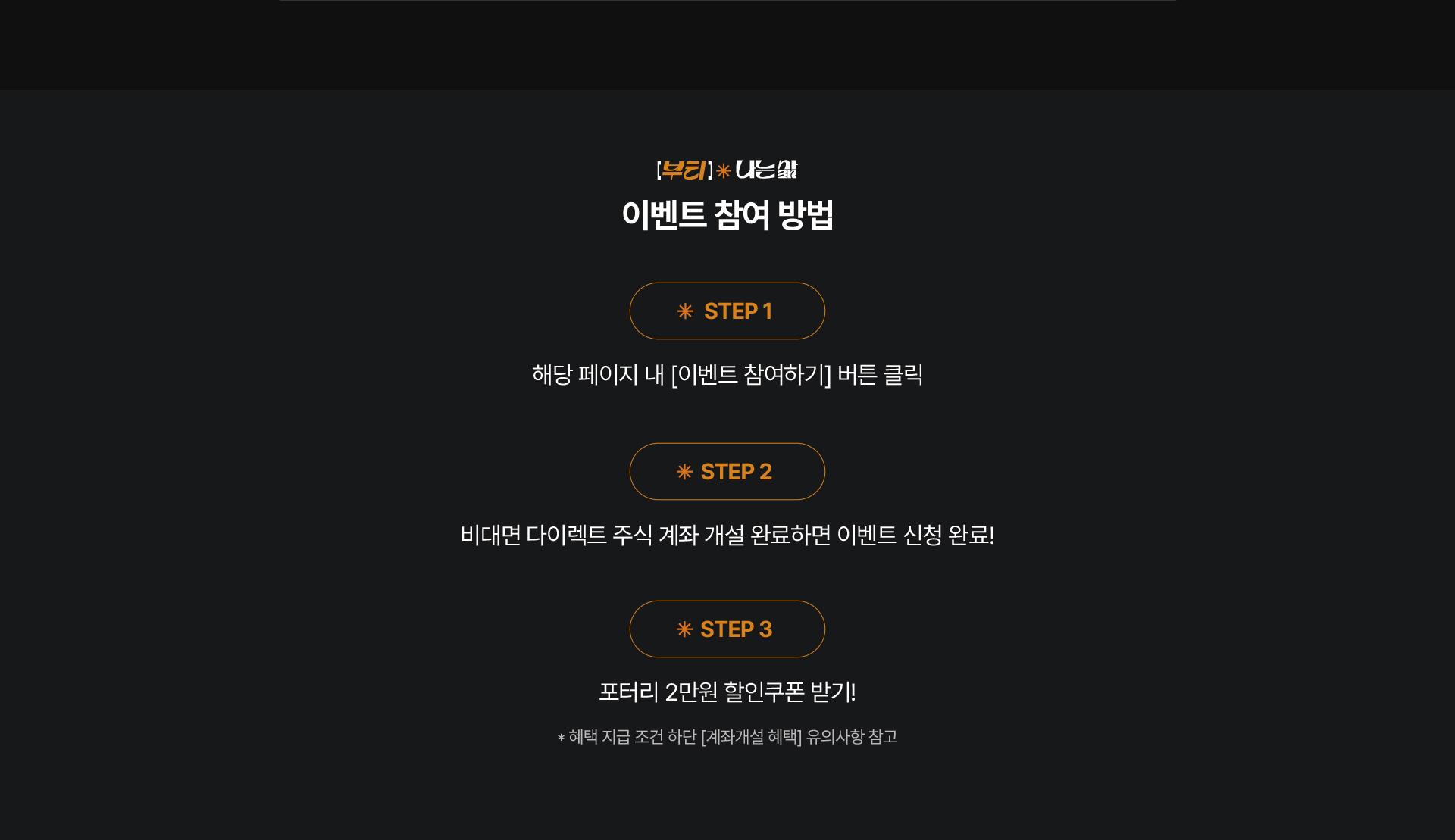 - - 투자지원금 2만원을 주식 매수(체결 기준)에 사용하지 않을 시 이벤트 신청일 기준 D+15일의 익영업일에 전액 회수(출금) 됩니다.