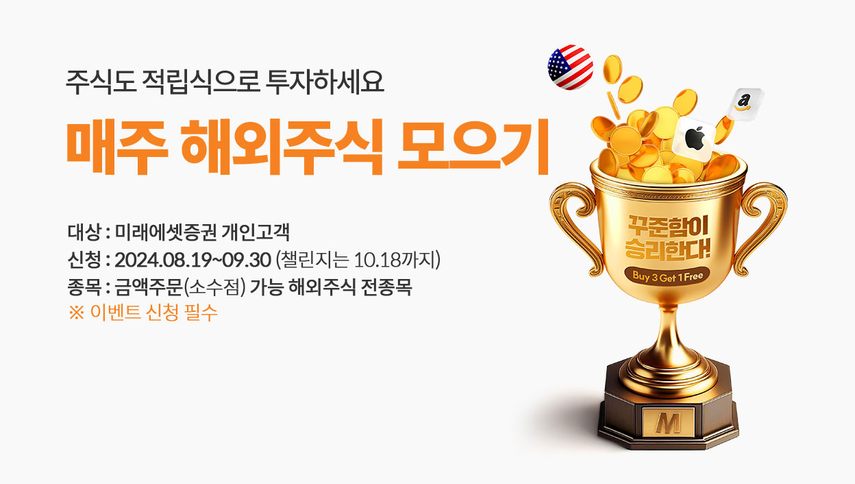 - · 본 이벤트 참여하기 위해서는 투자성향이 적합하여야 하고, 해외주식이 가능한 계좌보유, 외화증권약정, 해외주식 매매신청, 해외주식 소수점(금액주문) 거래 신청, 적립식 자동주문 서비스 신청이 필요합니다.